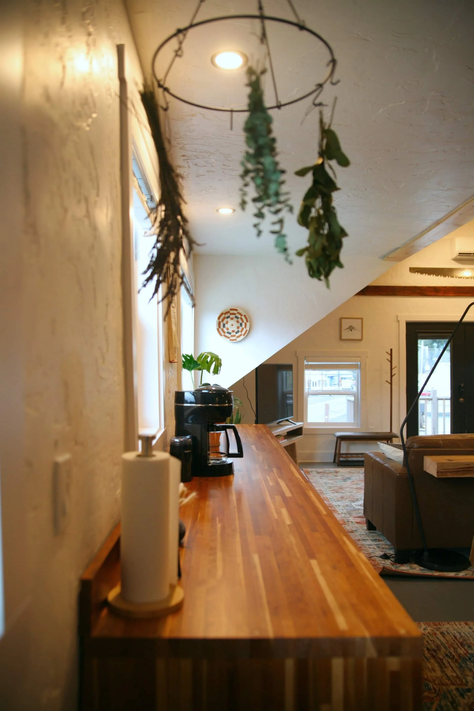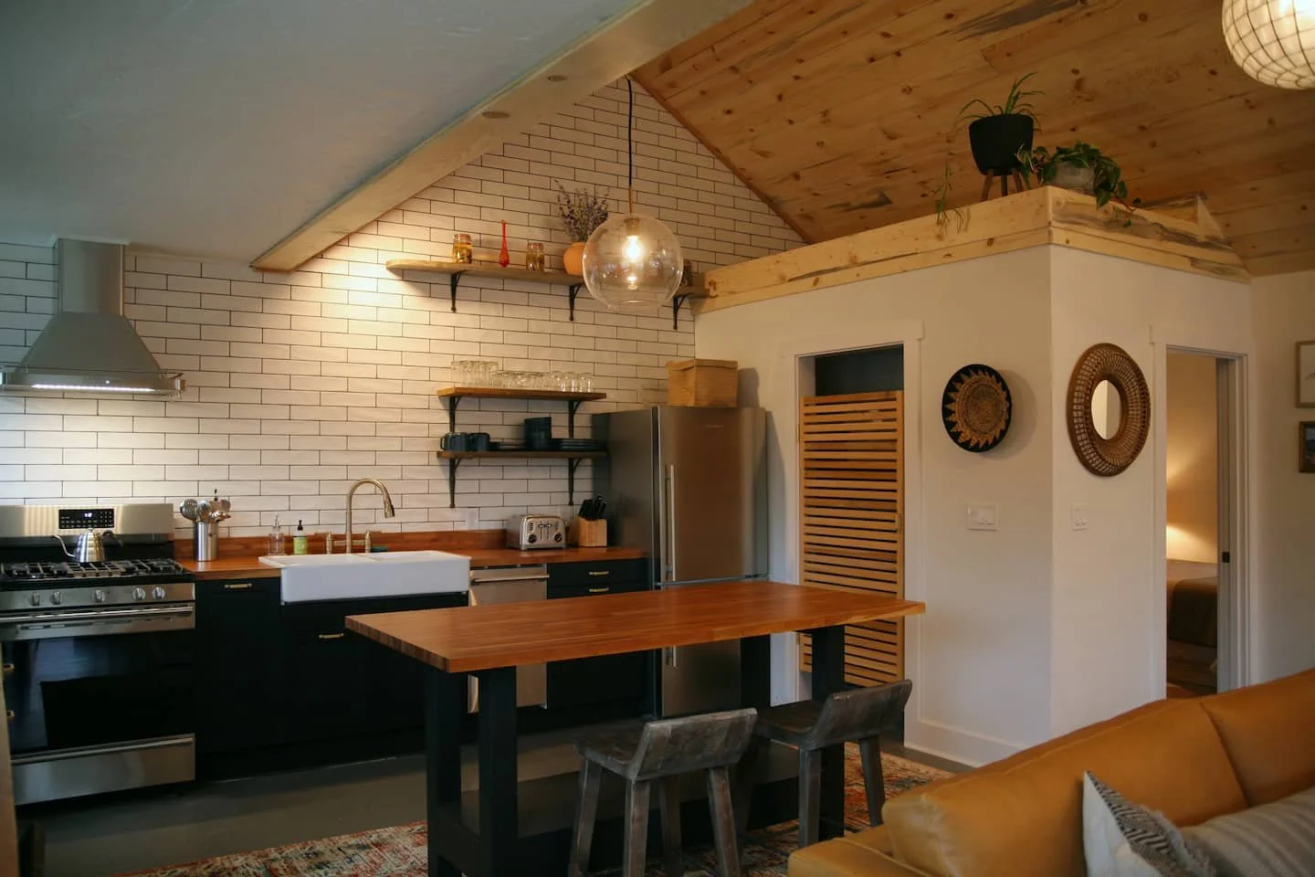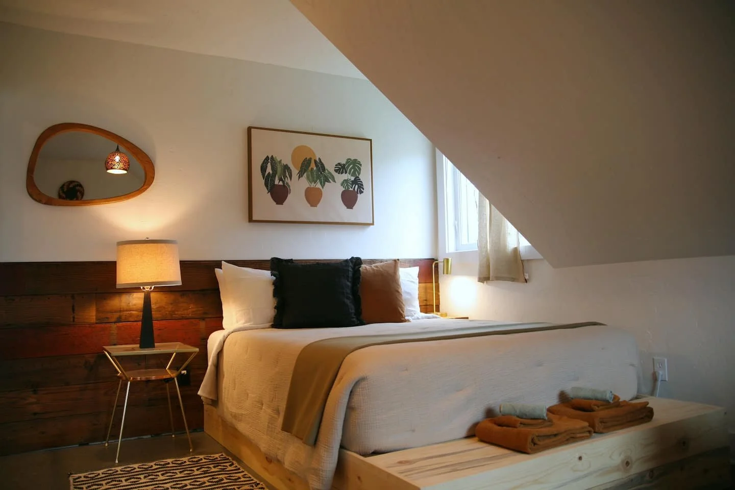 The Valley Loft is an 850 square foot apartment with an open kitchen/dining/living area, two bedrooms and one bathroom that comfortably sleeps 5 guests. Of our two apartments, the Valley Loft is the more family-friendly loft with a custom kids corner stocked with toys and art supplies.