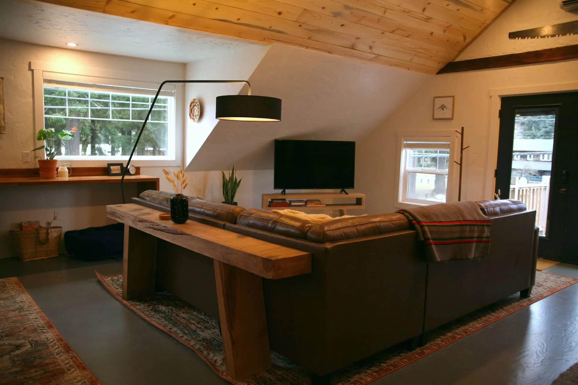 The two, newly renovated apartments look out over the center of our mountain town. The light-filled Valley Loft gazes south and down the rolling hills of the Cowlitz River valley. The north-facing Tahoma Loft takes in an epic view of Mt Rainier and the surrounding peaks from a private balcony above our beer garden